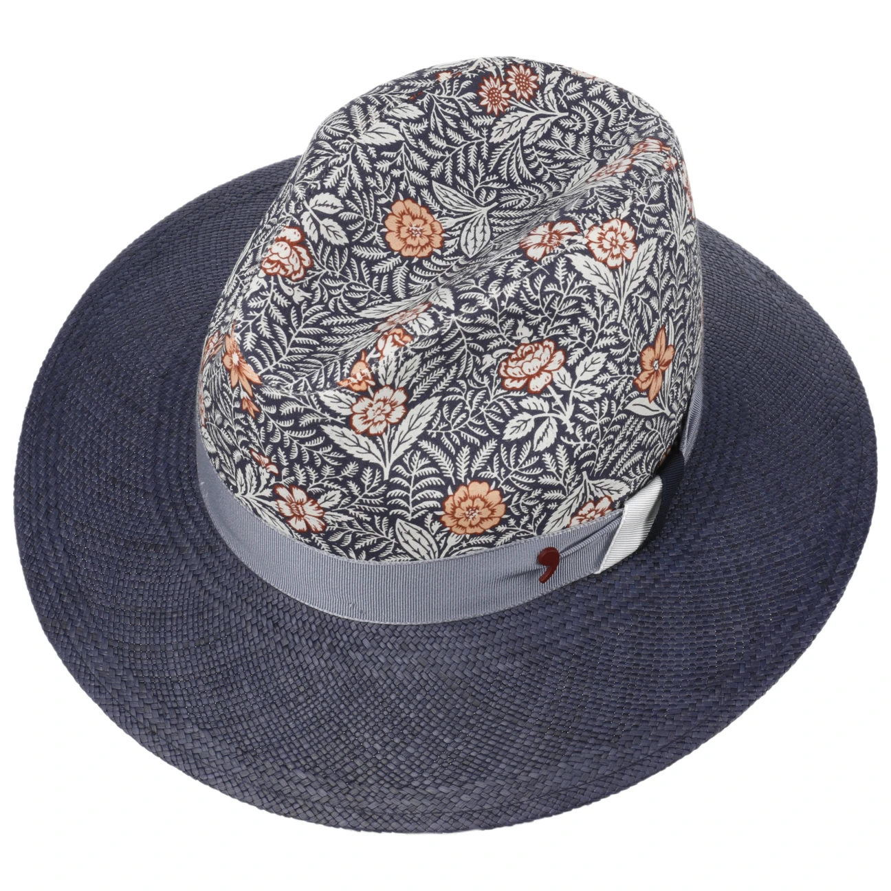 Faszinierende Leichtigkeit. Der Sommerhut aus dem Hause Alfonso D´Este macht durch die Kombination zweier hochwertiger Materialien auf sich aufmerksam: Die Krone im floralen Muster besteht aus atmungsaktiver und hautsympathischer Baumwolle, die Krempe ist aus leichtem Panamastroh gefertigt. Den Übergang verziert ein dreifarbiges Hutband mit charakteristischem Markenemblem. In Italien von Hand gefertigt.