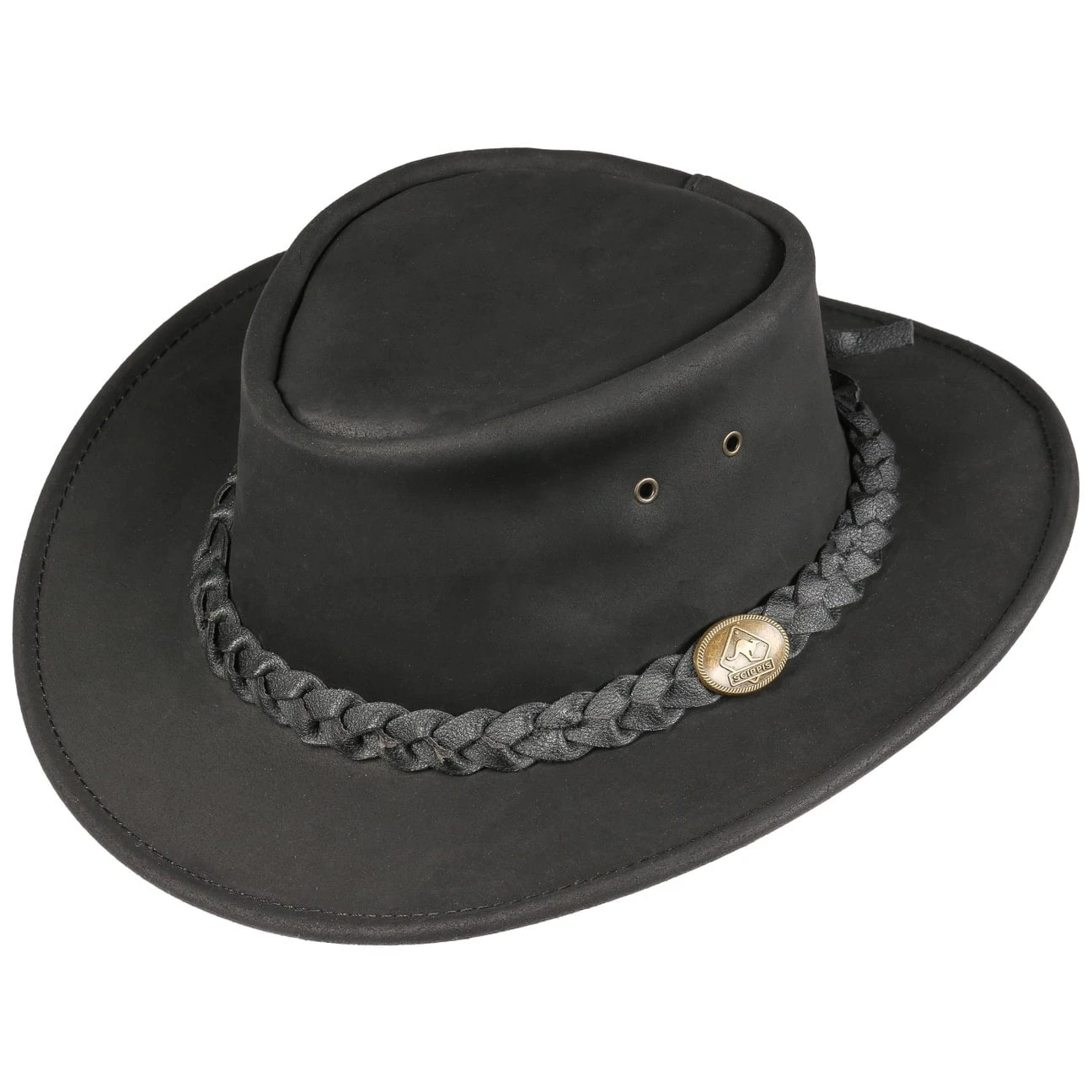 Abenteuer in Down Under. Für den rustikalen Traveller hat das australische Label Scippis ein Material aus 100% Rindsleder gewählt. Mit seinen robusten Eigenschaften eignet sich der Outdoorhut nicht nur für einen Trip durchs Outback, er übersteht auch alle Strapazen des Großstadtlebens. Die geflochtene Garnitur mit markengeprägter Metallschnalle rundet den markanten Look ab. Wasserabweisende Qualität.