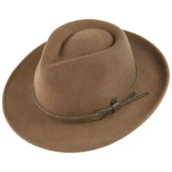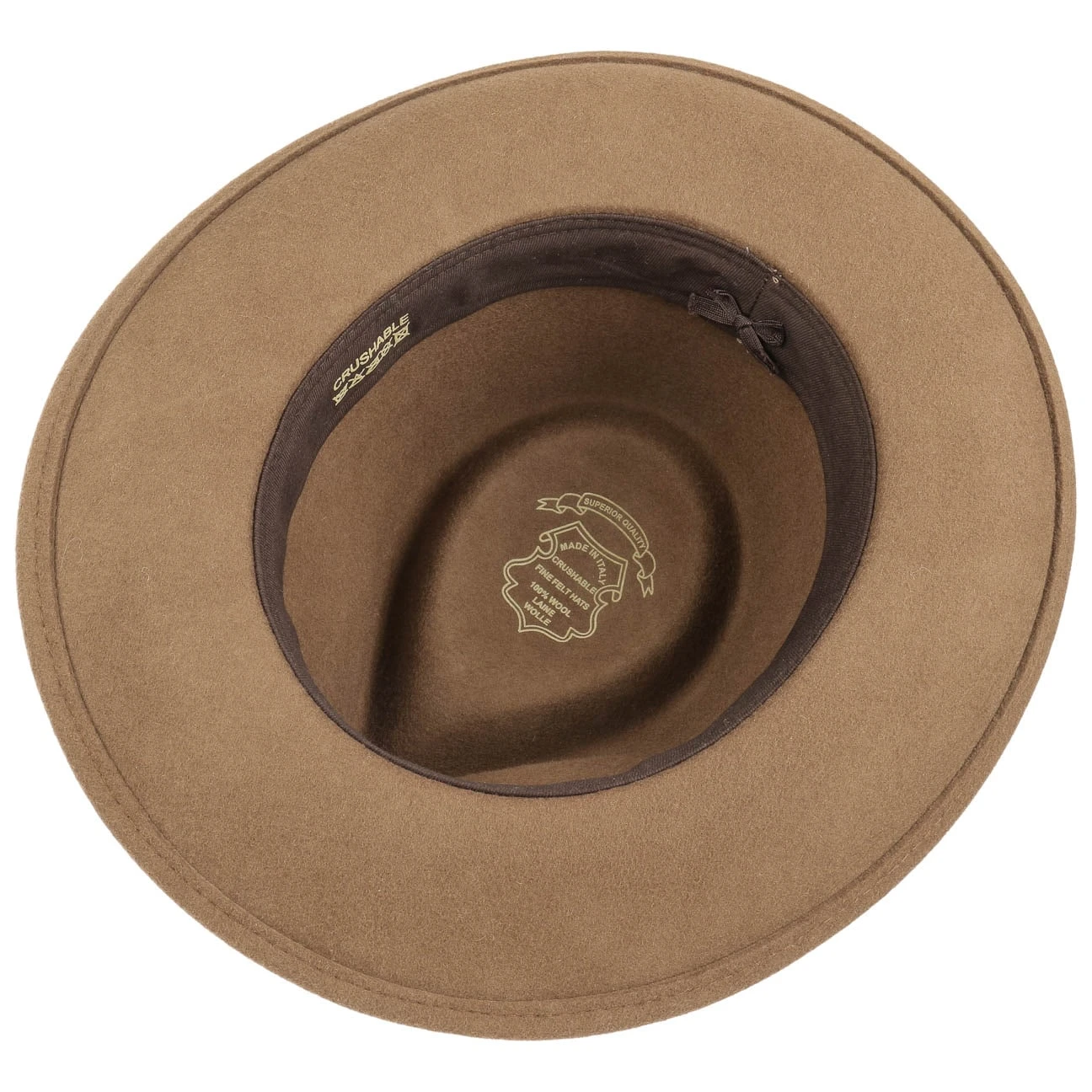 Funktionaler Chic. 100% Wollfilz verleiht dem Outdoorhut seine robusten und witterungsbeständigen Eigenschaften. In wasserabweisender Qualität übersteht er auch einen Regenschauer. Bei Bedarf lässt sich der Bogarthut zudem ganz klein zusammenrollen oder knautschen, ohne dabei an Form zu verlieren. Seine aparte Optik verdankt er der attraktiv gestalteten Garnitur im Leder-Look. In Italien gefertigt.