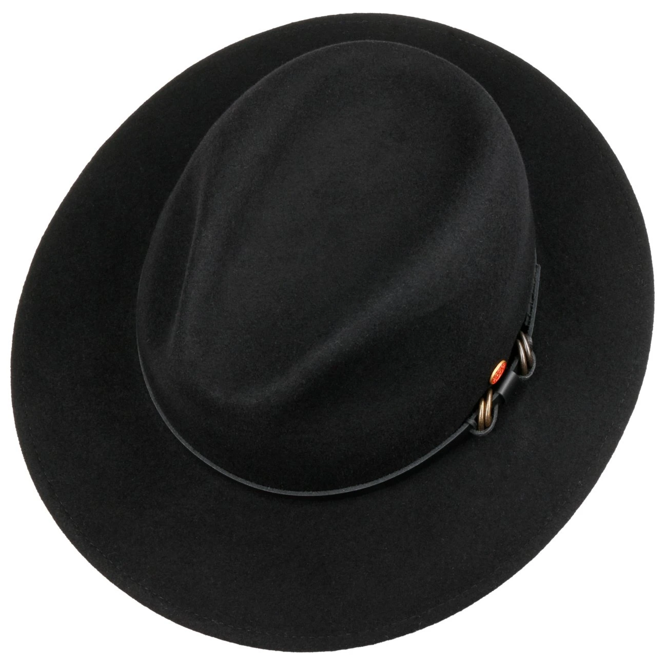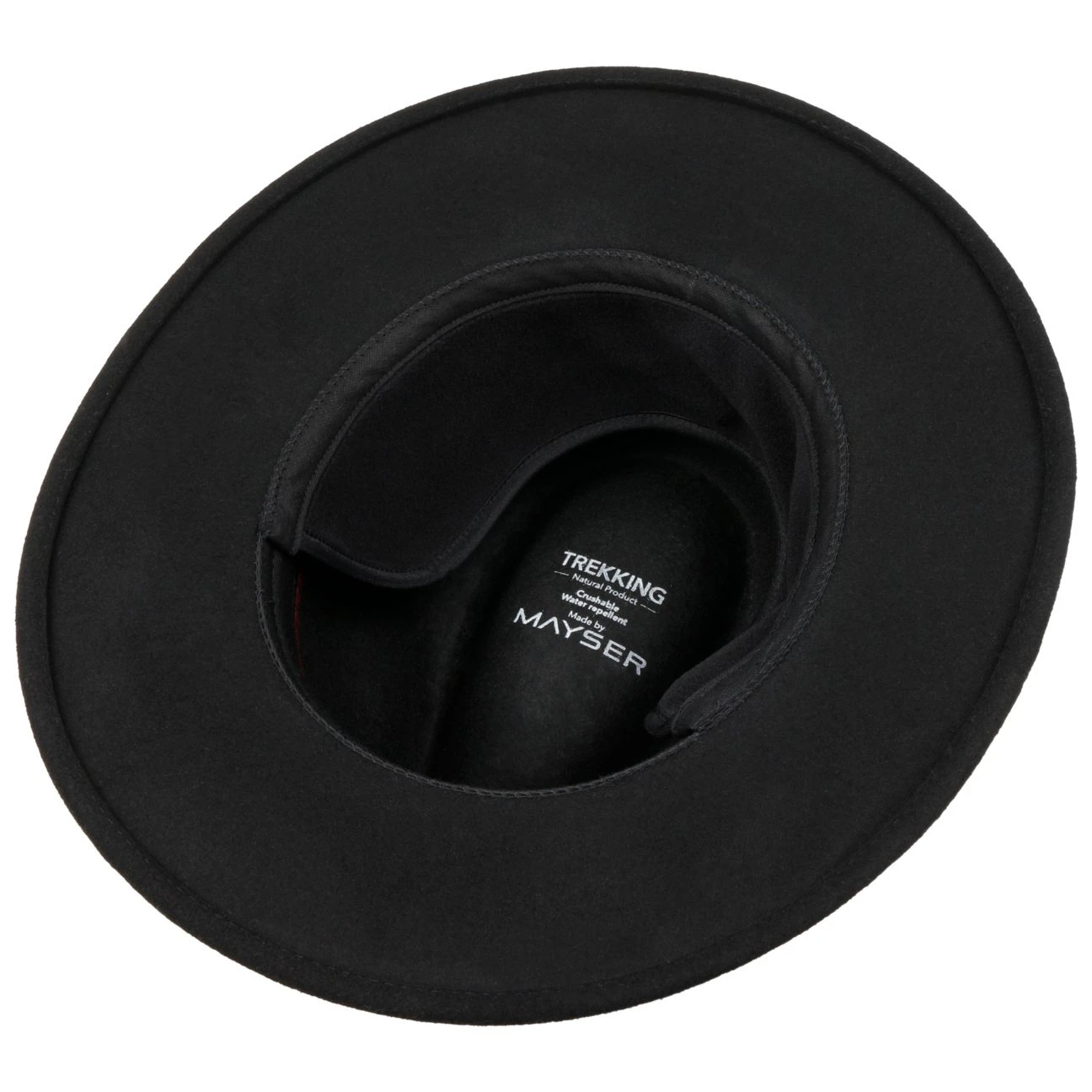Für Wind und Wetter. Der Outdoorhut mit UV-Filter ist ein komfortabler Allwetterschutz. Die breite Krempe schützt vor Sonne und der verarbeitete Wollfilz überzeugt gleichzeitig mit seinen wasserabweisenden und schmutzresistenten Qualitäten. Innen beherbergt der knautschbare und leicht zu tragende Trekkinghut von Mayser einen verborgenen Ohrenschutz aus wärmeisolierendem Fleece. Handgefertigt und mit ringumschlungener Ledergarnitur dekoriert.