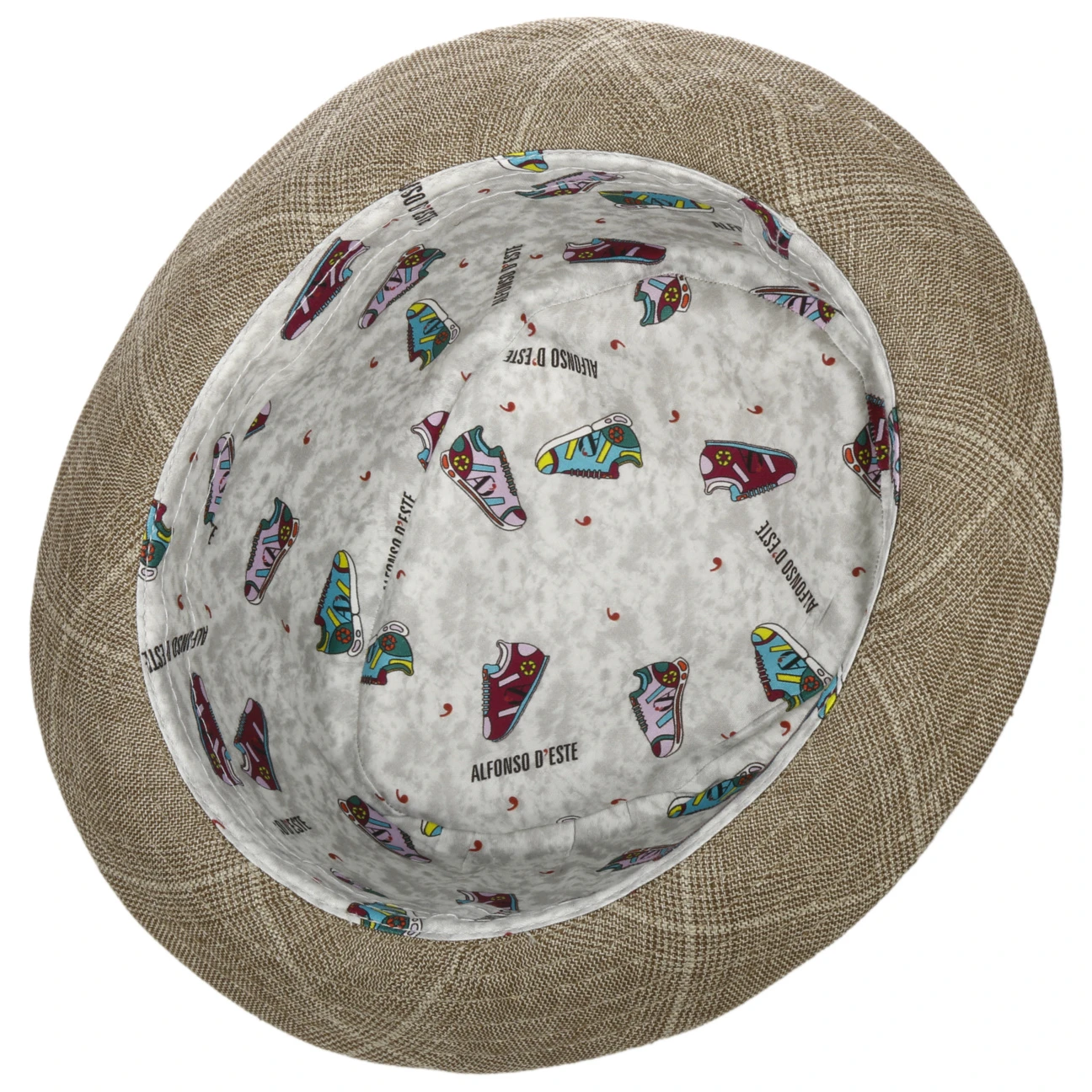 Faszinierend verspielt. 100% Leinen in klima- und temperaturregulierender Qualität stattet den Player von Alfonso D´Este mit sommertauglichen Eigenschaften aus. Ein Futter aus 100% Baumwolle steuert atmungsaktiven Tragekomfort bei. Das fantasievolle Design mit karierter Krone, gestreifter Krempe und meliertem Garniturband rundet die stilvolle Alltagsgarderobe auf modische Weise ab. In Italien von Hand gefertigt.