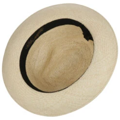 Mondäner Stil. Der Panamahut aus dem Hause Borsalino beherrscht das Spiel mit den Kontrasten. Eine locker gehäkelte Krone trifft auf eine dicht geflochtene Krempe, für den Übergang sorgt eine farbige Ripsbandschleife. Das mondäne Design harmoniert hervorragend zur gehobenen Freizeit-Garderobe. Leichtes Panamastroh stattet den Bogarthut mit angenehmen Trageeigenschaften für warme Tage aus. Hergestellt in Italien.