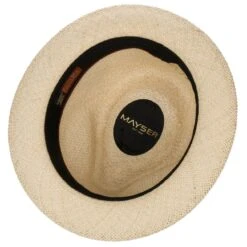 Traditionsreicher Stil. In traditioneller Handarbeit gewoben, besticht der Panamahut von Mayser durch sein stilvolles Design und luftig-leichte Trageeigenschaften. Seine kecke Ausstrahlung verdankt er der schmalen Krempe, einem aufwendig gearbeitetem Ledergarniturband und der seitlich eingesteckten Feder. Zur Sommergarderobe kombiniert, macht der Strohhut stets einen eleganten Eindruck. Hergestellt in der EU.